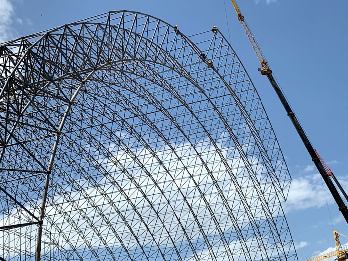 (2)网架加工前应对现场尺寸进行复测,确认无误后方可进行加工、安装;网架制作、运输、安装应遵守《空间网格结构技术规程》JGJ7-2010、《钢网架怒江螺栓球节点》JG/T 10-2009、《钢网架怒江螺栓球节点用高强度螺栓》 GB/T 16939-2016、《怒江钢结构怒江工程怒江施工规范》 GB50755-2012、《怒江钢结构怒江工程怒江施工质量验收标准》 GB50205-2020。